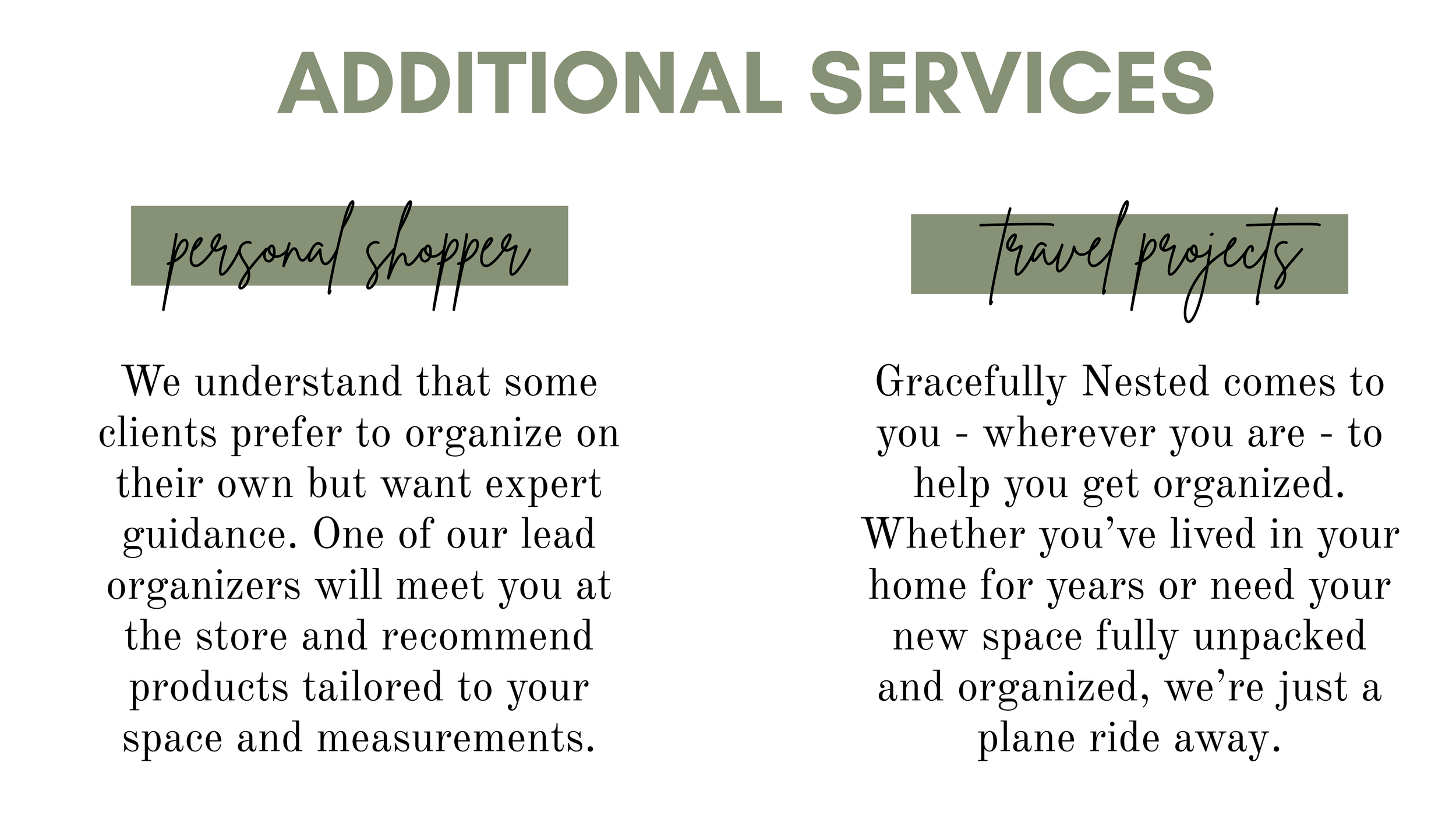To secure your session, a deposit is required at the time of booking. Hourly rates apply to labor only; any products recommended by Gracefully Nested and approved by the client are invoiced separately.